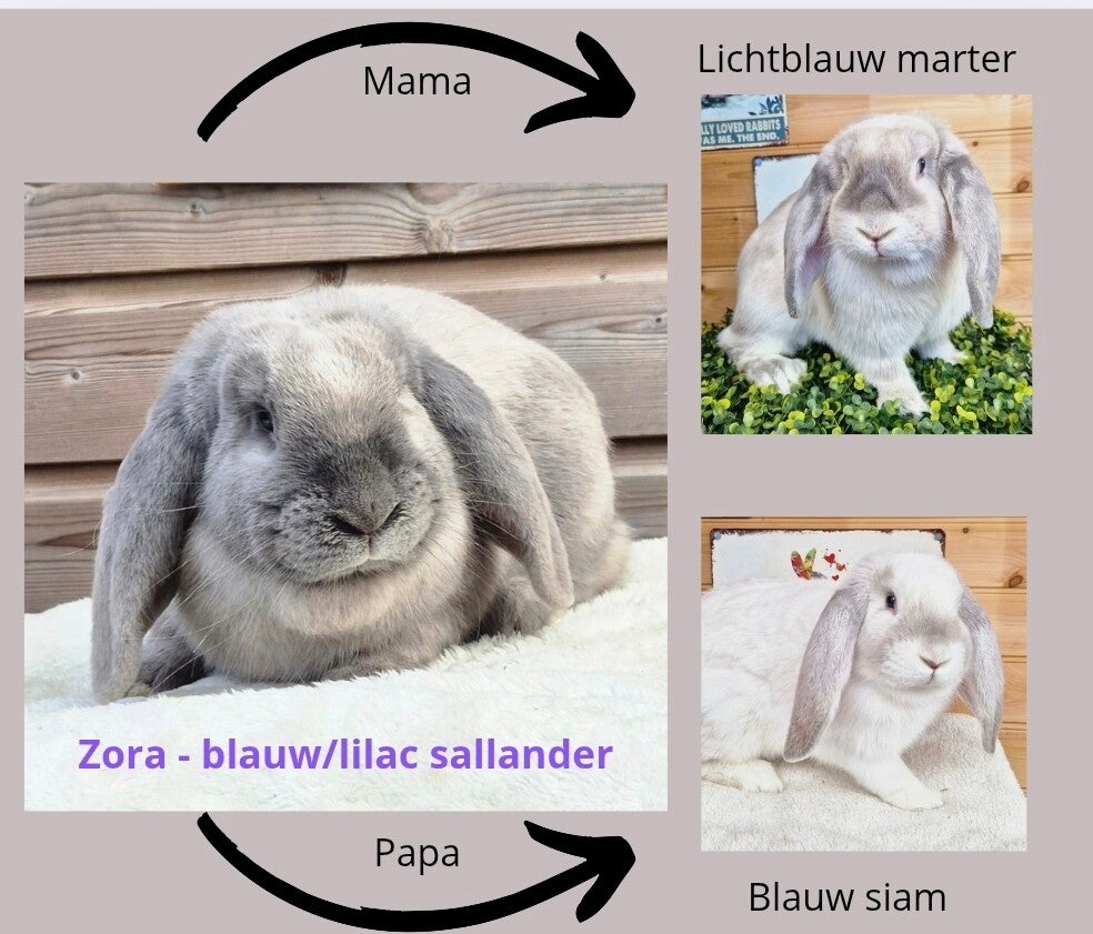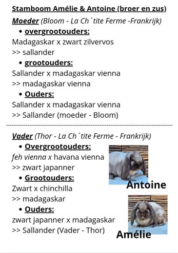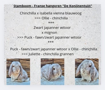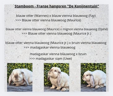Opgelet ; deze is niet officieel geregistreerd zoals bij honden of katten het geval kan zijn. Bij konijnen wordt dit nooit geregistreerd, maar dat wil niet zeggen dat je als fokker niet alle mogelijke foklijnen kan bijhouden en hierover informeren.